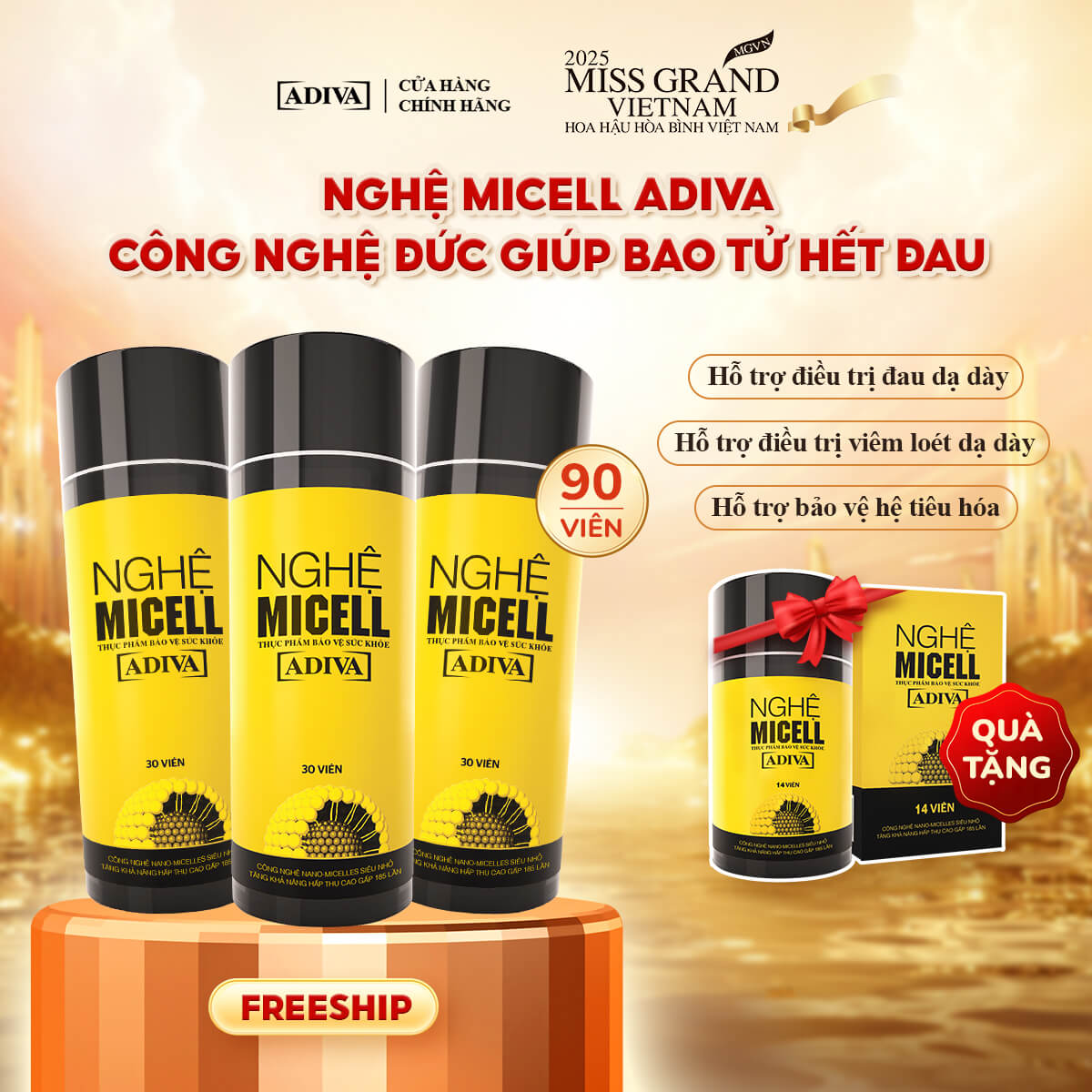 * Nghệ Micell ADIVA là sản phẩm hỗ trợ điều trị và ngăn ngừa tái phát các bệnh dạ dày như: Đau dạ dày, ợ chua, ợ nóng, trào ngược, vi khuẩn HP, viêm loét dạ dày, tá tràng,…