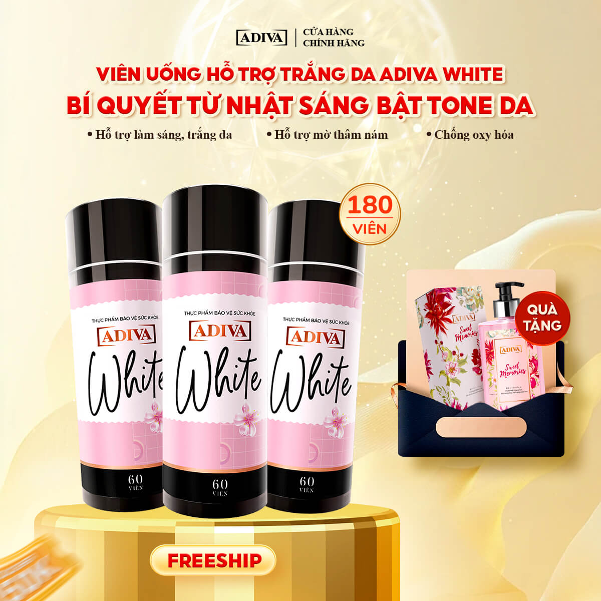 Viên uống trắng da ADIVA White giúp cơ thể bổ sung Glutathione tự nhiên cùng các vitamin quý hỗ trợ làn da trắng sáng, mờ thâm nám, tăng cường hàng rào bảo vệ da trước các tác nhân gây hại từ môi trường; chống oxy hóa, khử gốc tự do an toàn, hiệu quả cao.